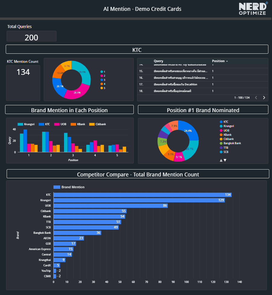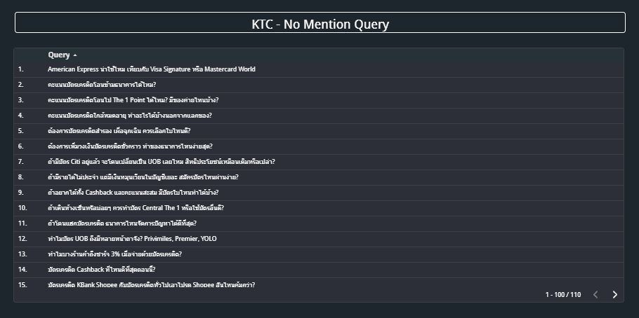 คำตอบคือเราไม่มีทางรู้แน่ชัด เนื่องจาก AI ทุกเจ้ายังไม่มีข้อมูลเรื่อง Query ให้ดู แต่เราสามารถคาดเดาได้ด้วยการถาม AI ให้ AI จำลองตัวเองเป็นผู้ใช้งาน และคิดคำถามที่ผู้ใช้งานจะพิมพ์ถาม AI ในหมวดเกี่ยวกับ “บัตรเครดิต” โดยที่คำตอบจะต้องมีการ Mention ชื่อ Brand บัตรเครดิตด้วย พร้อมใส่จำนวน Query ที่ต้องการ ส่วนนี้แนะนำว่ายิ่งเยอะ ยิ่งเก็บข้อมูลภาพรวมได้ละเอียดมากกว่า