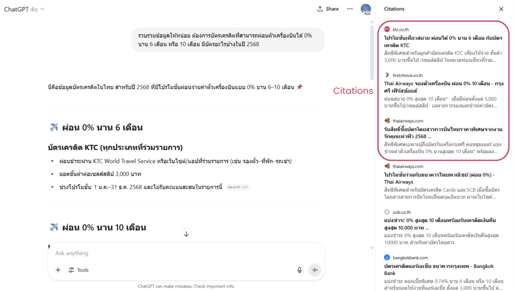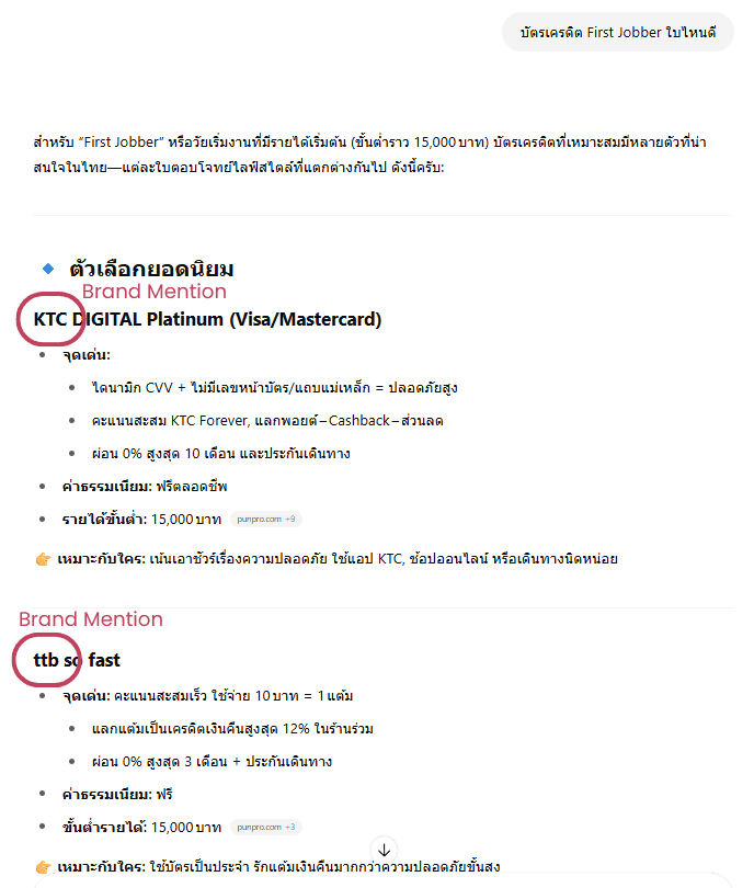 จากคำตอบของ AI เราจะเห็นว่ามีชื่อแบรนด์อย่าง KTC และ ttb อยู่ในคำตอบด้วย ส่วนนี้เองเป็น Brand Mention ยิ่ง AI พูดถึงแบรนด์ของคุณในอันดับต้น ๆ จะยิ่งดีกับแบรนด์ของคุณ