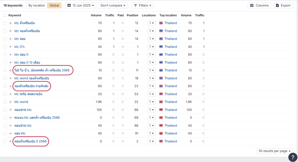 เมื่อกดเข้าไปใน Keywords จะปรากฏทุก Keyword ที่บทความนั้นติดอันดับออกมา เราสามารถเลือกเฉพาะ Keyword ที่ไม่มีชื่อแบรนด์คู่แข่ง ไปเพิ่มในคอนเทนต์ของเราได้