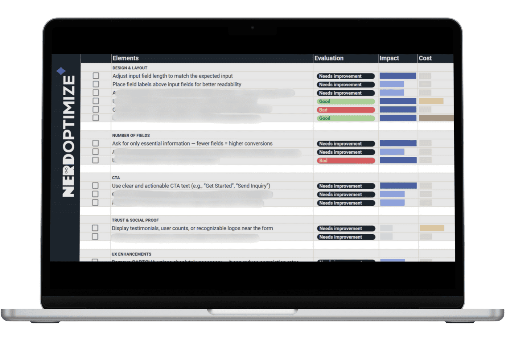 รูปด้านล่างคือตัวอย่าง CRO Checklist ที่คุณจะได้รับเมื่อดาวน์โหลดไปแล้ว ภายในจะมี Checklist ขององค์ประกอบต่าง ๆ ในหน้า Page สำคัญของเว็บไซต์ ที่เกี่ยวข้องกับการเกิด Conversion โดยตรง ไม่ว่าจะเป็น Home Page, Lead Form, Contact Us, Pricing Page, Product Page, Category Page, Checkout Page และอีกมากมาย โดยคำแนะนำในการปรับเปลี่ยนองค์ประกอบต่าง ๆ ผ่านการพิสูจน์โดยการทำ AB Testing ในเว็บไซต์ต่าง ๆ มาแล้ว