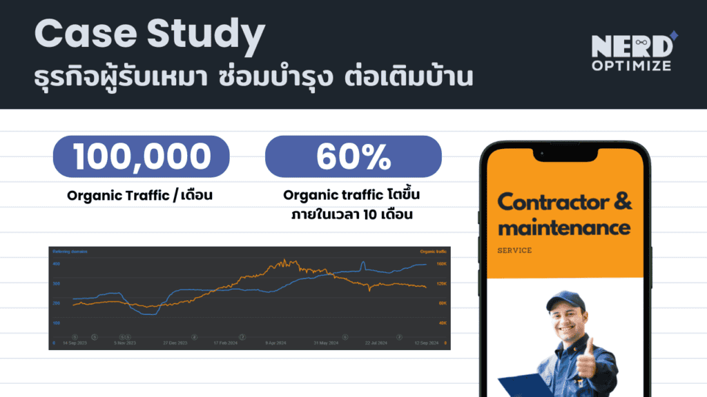 หลังจากที่ ธุรกิจผู้รับเหมา ช่างซ่อมบำรุง ต่อเติมบ้าน เริ่มต้นทำโปรเจคกับเราในช่วงเดือนธันวาคม 2566 มี Traffic ประมาณ 60,000 / ต่อเดือน ปัจจุบันเดือนกันยายน 2567 มี Traffic ประมาณ 100,000 / ต่อเดือน ซึ่งถือว่ามีเปอร์เซ็นต์การเติบโตขึ้นกว่า 66.67% ภายในระยะเวลาไม่ถึง 1 ปี เป็นอีกหนึ่งโปรเจ็กต์ที่ทาง NerdOptimize ภูมิใจกับผลลัพธ์ในการทำ SEO ที่ได้เป็นส่วนหนึ่งในการสร้างการเติบโตให้กับ ธุรกิจผู้รับเหมา ช่างซ่อมบำรุง ต่อเติมบ้าน